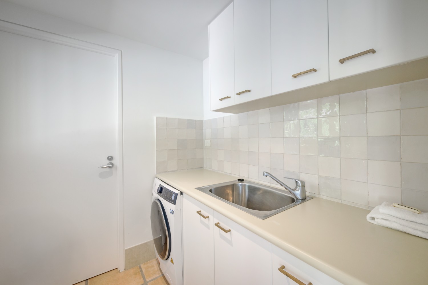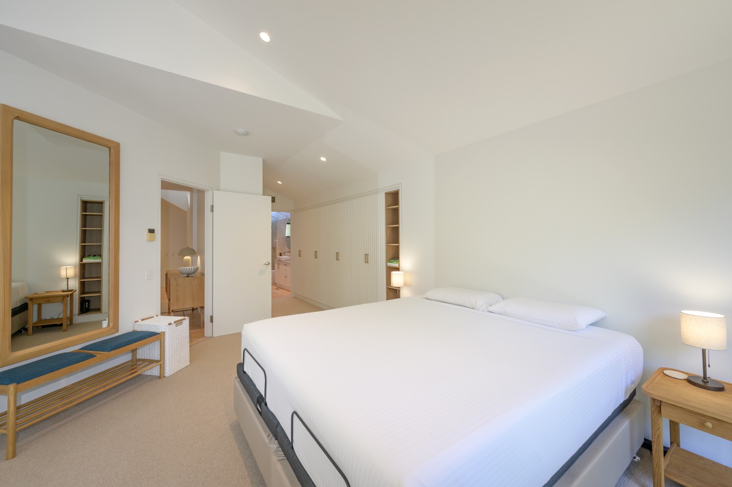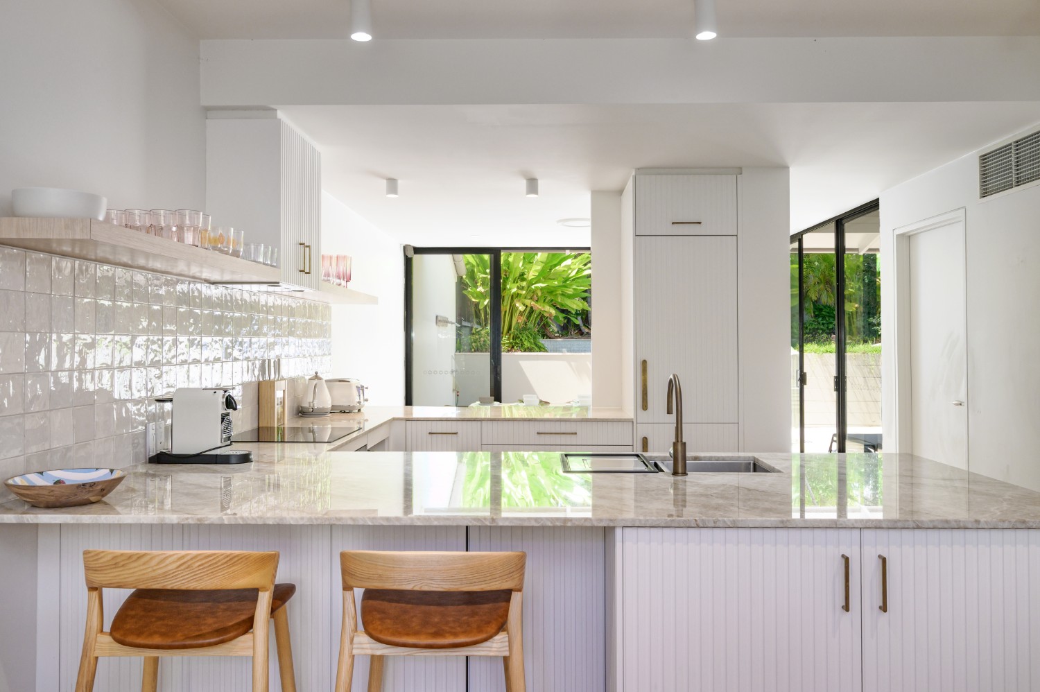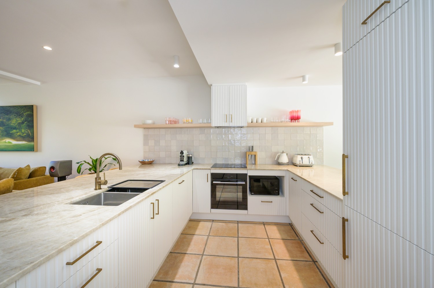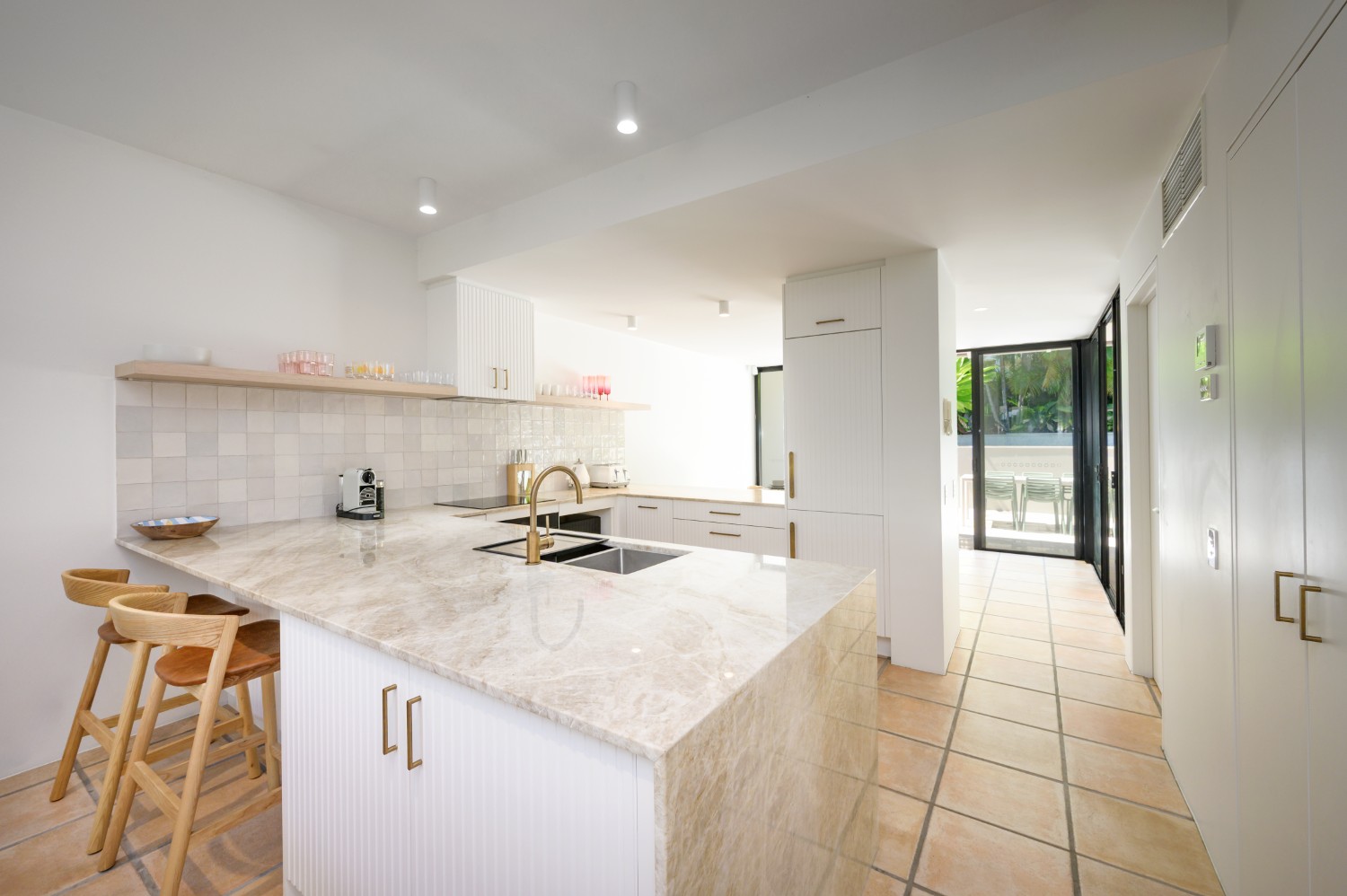 The kitchen is a true architectural showpiece, boasting Taj Mahal stone benchtops with waterfall edges, fluted timber cabinetry and high-end appliances to deliver both beauty and utility. Appointed with functionality in mind, the kitchen provides everything you could require whilst cooking on your holiday. A discreet servery effortlessly links the kitchen to the dining space, seating 6, ensuring effortless entertaining.