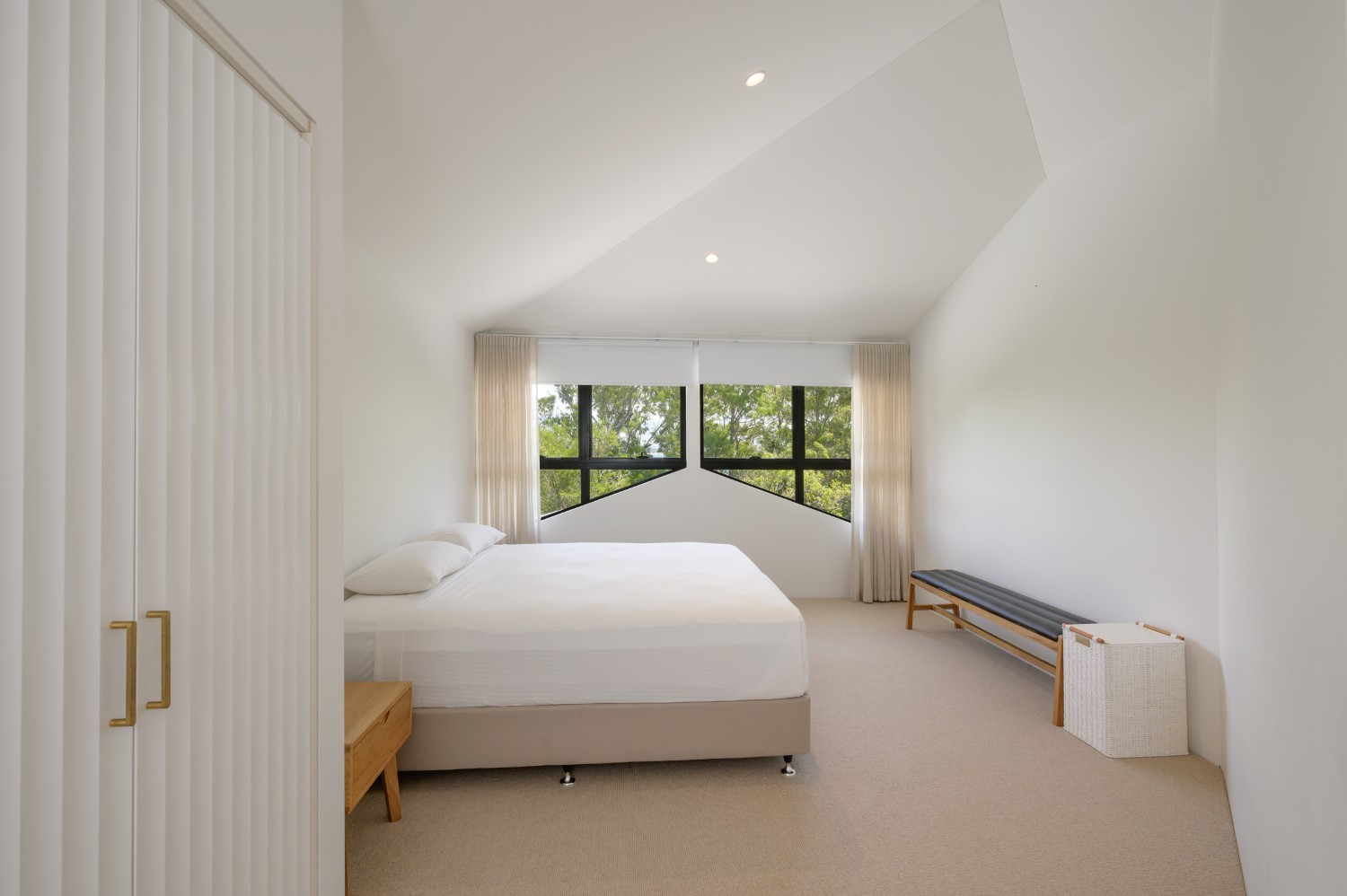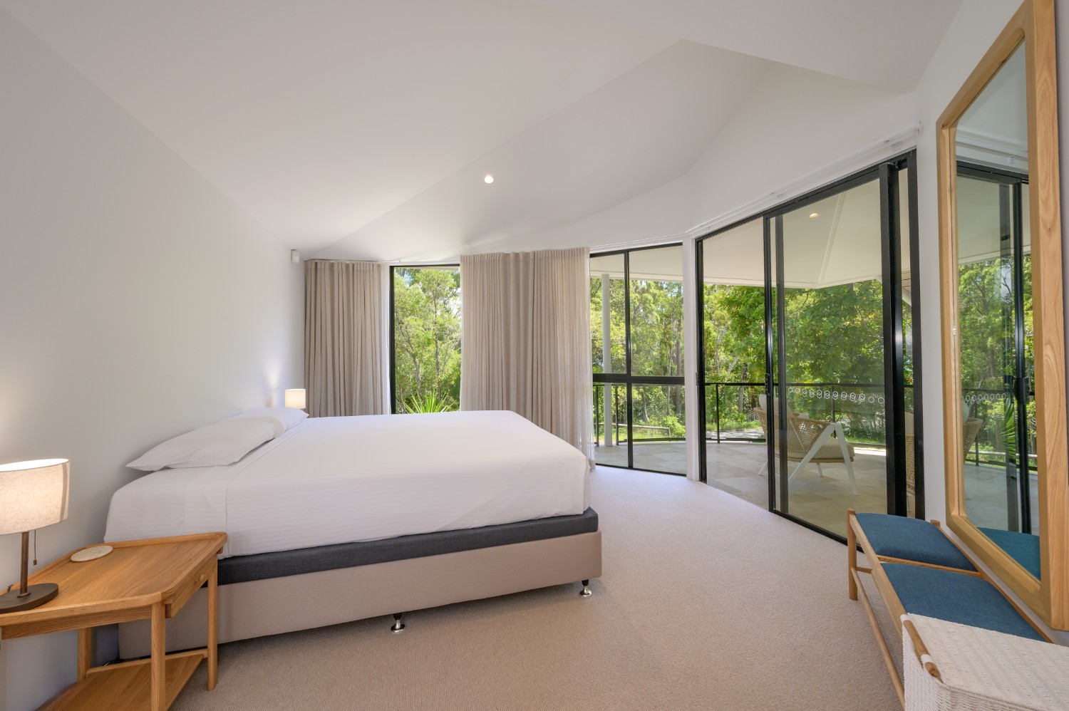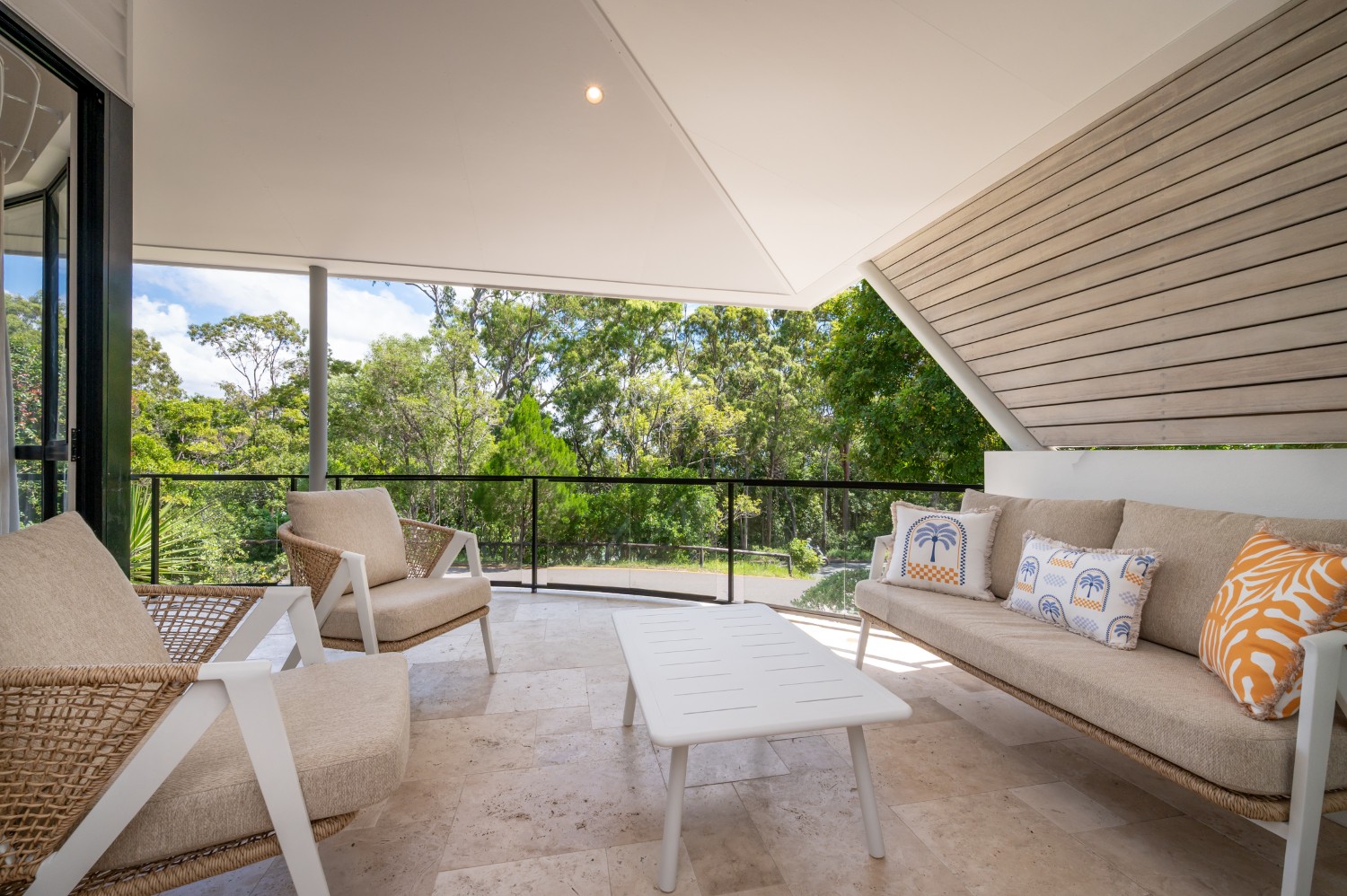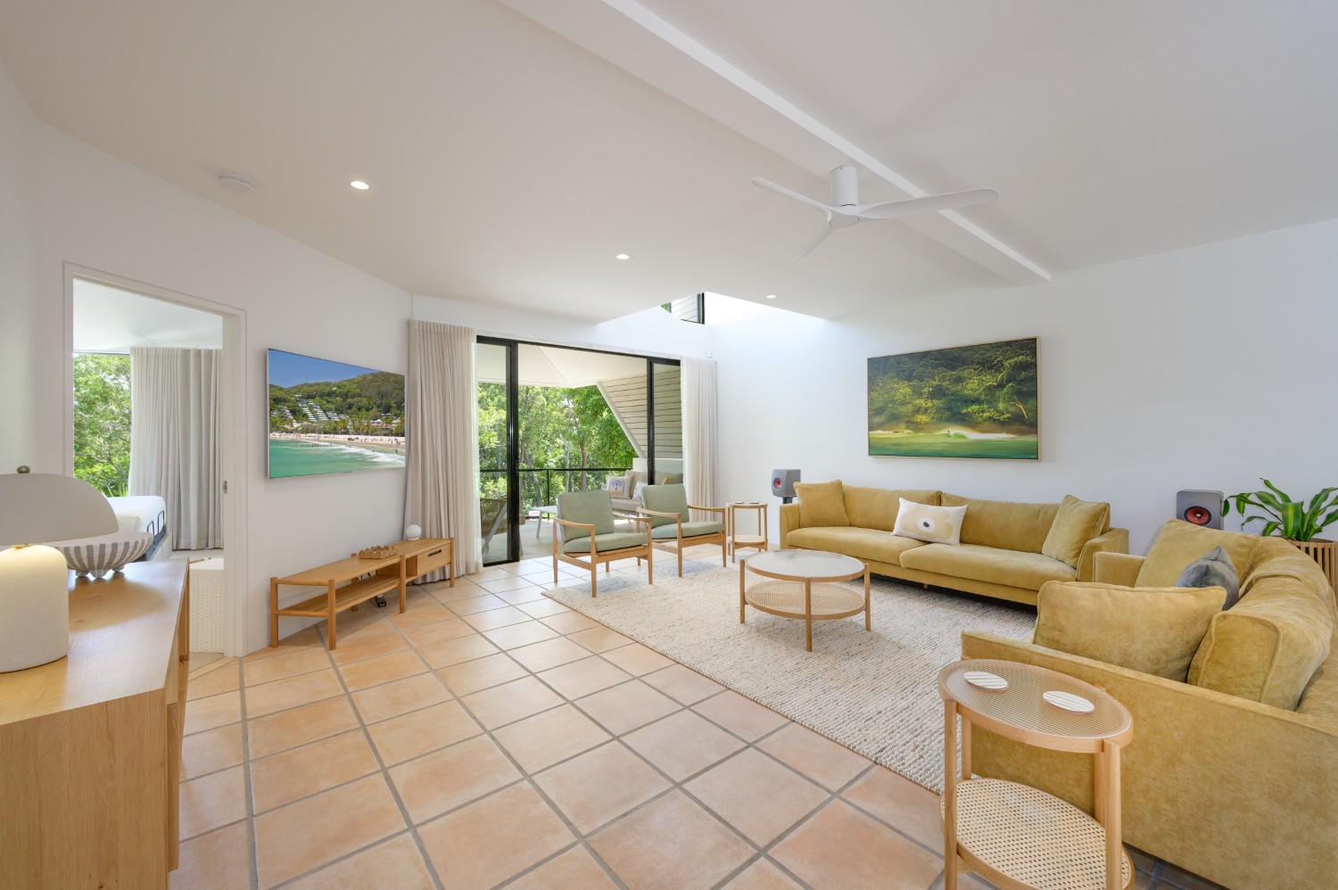 Ascend the stairs to the heart of the home, an expansive living and entertaining zone with filtered vistas across Laguna Bay and Noosa North Shore. Immaculately furnished with a nod to mid-century style, the elegant, high-ceilinged living space invites you to settle in, unwind with a good book or share precious time with your loved ones. The front terrace beckons from beyond the living area, ideal for watching the sunset across the bay with a glass of champagne in hand. Step back into the home and discover the master suite, a private sanctuary complete with curved walls, soaring ceilings, a sumptuous king bed and an abundance of built-in robes. The ensuite exemplifies quiet luxury, featuring travertine finishes, gold accents, skylights, double sinks, and a rain shower.