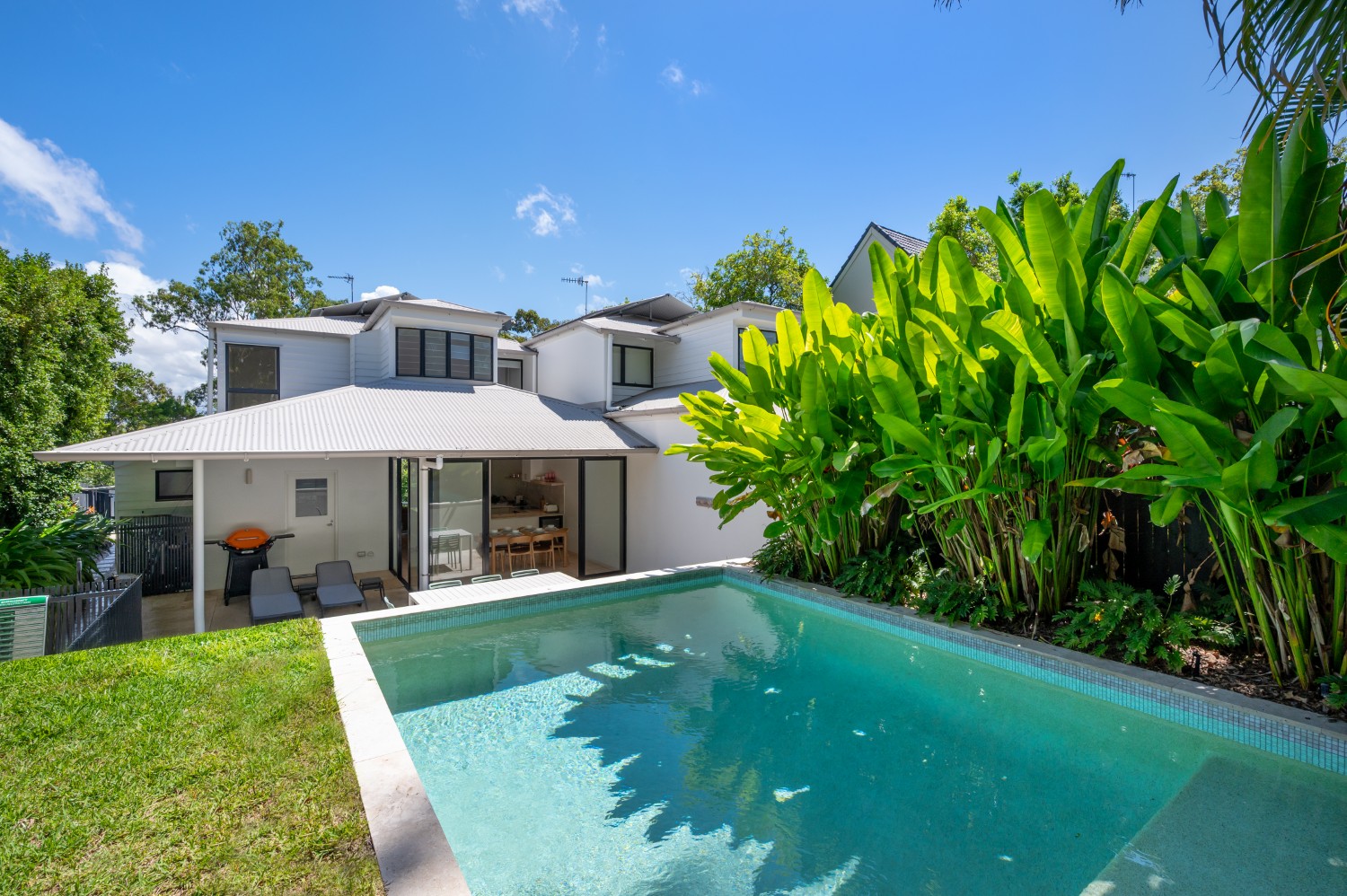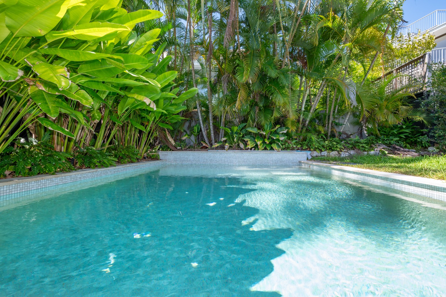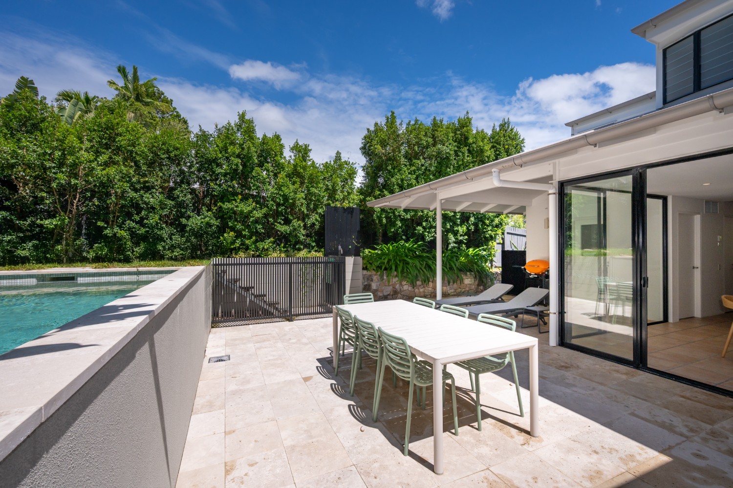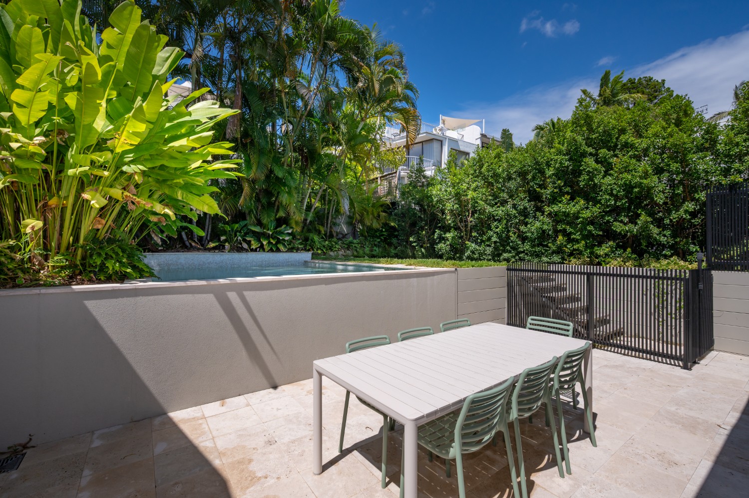 To the rear, the outdoor terrace embodies the essence of indoor-outdoor living that Noosa is famous for. Stepping through sliding doors, the home seamlessly dissolves into an alfresco dining terrace and tropical courtyard garden. With a stunning mosaic-tiled pool and lush lawn complete with two sunloungers and Weber BBQ, it’s a private and serene haven intentionally designed to bask in the best Noosa has to offer.