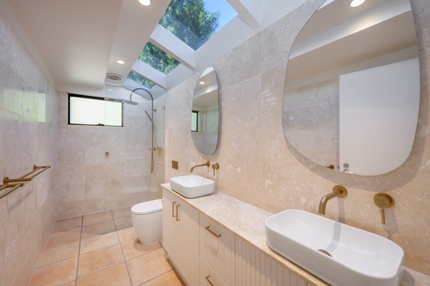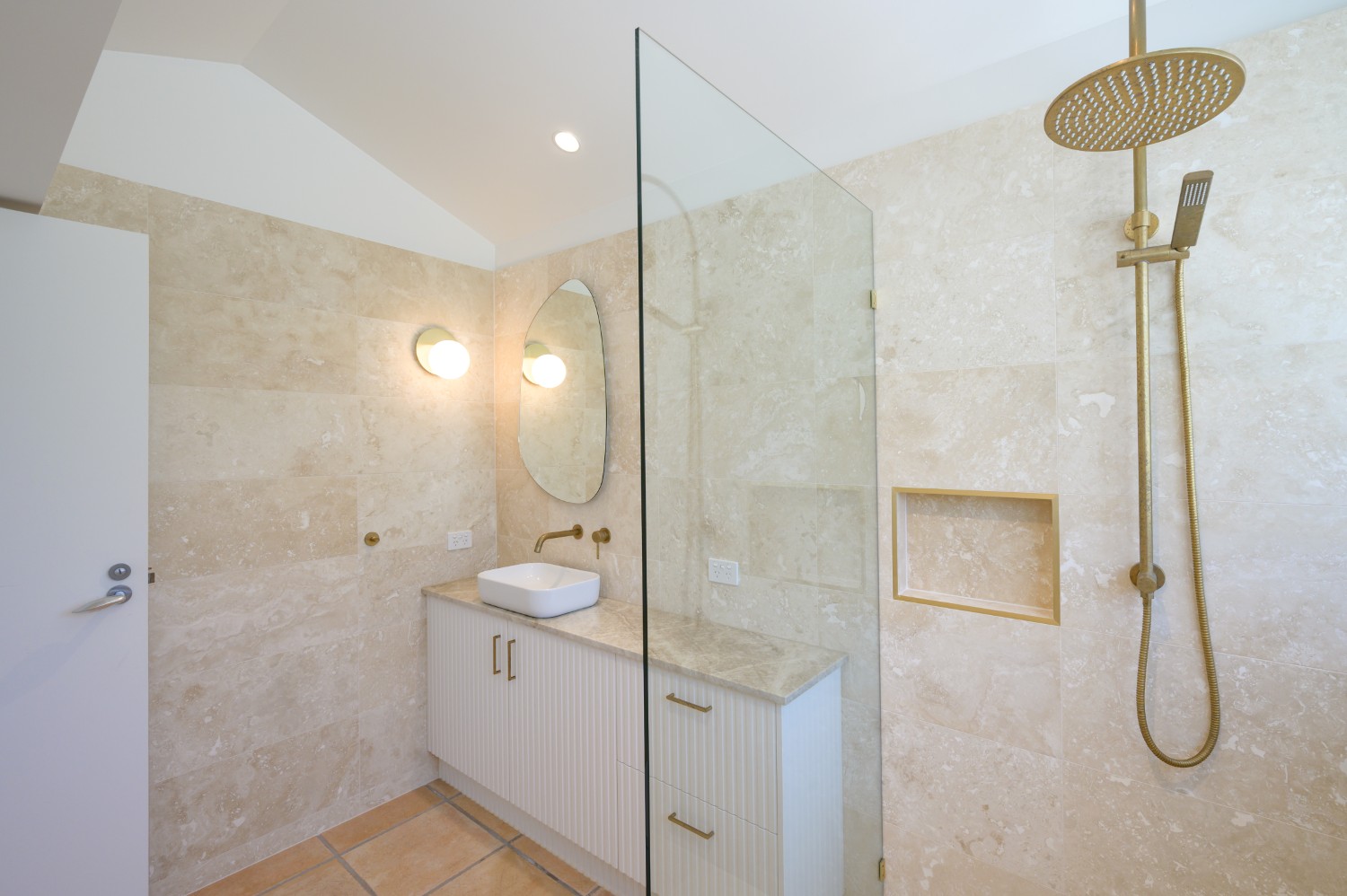 Upstairs, two spacious, high-ceiling bedrooms each boast split-mattress king beds for practical family living, along with built-in robes and an abundance of natural light. The larger of the two bedrooms enjoys a stunning outlook across the ocean. A central family bathroom, styled in the same luxurious travertine as the master suite, maintains a sense of continuity and refined design.